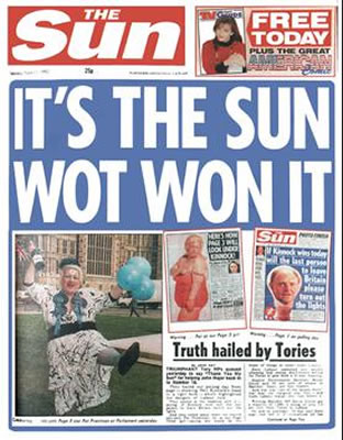 In the graphic at right, Murdoch's Sun, the largest newspaper in Britain, publicly beats its Tarzan-like chest telling the British public that it was them - Murdoch's newspapers - that won the election for Thatcher. That would seem to confirm that Murdoch runs a political propaganda machine and that his audience should be wary of trusting Murdoch media outlets.